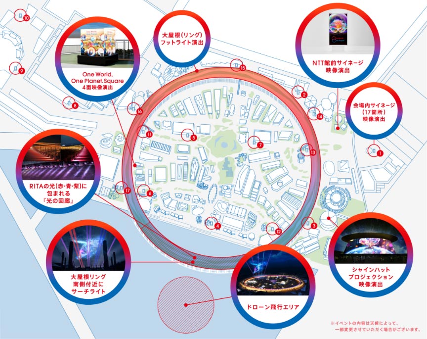 会場全体の音響や照明装置、プロジェクションマッピング、ドローンショーなどが連動する壮大&壮観なショー。未来への願いをバーチャル万博アプリから投稿することで、誰でも、どこからでも参加することもできる。