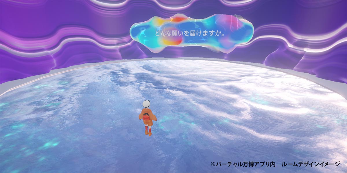 誰かの幸せや健康、この星の未来を想う、そんな利他的な願いが集まることで、 バーチャル万博内の願いの樹が成長します。また、会場でのセレモニー開催時にバーチャル万博の「One World, One Planet.」ルームに入ると…。