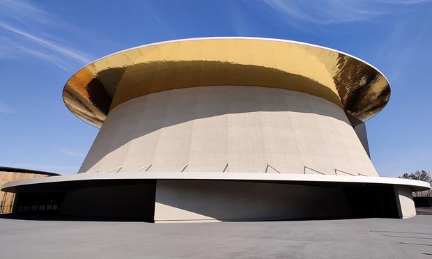黄金に輝く円形の大屋根と、荒々しい表情の壁面が大地から立ちあがる力強い姿によって、1970大阪万博の「太陽の塔」を連想させる、会場全体のシンボルをつくります。