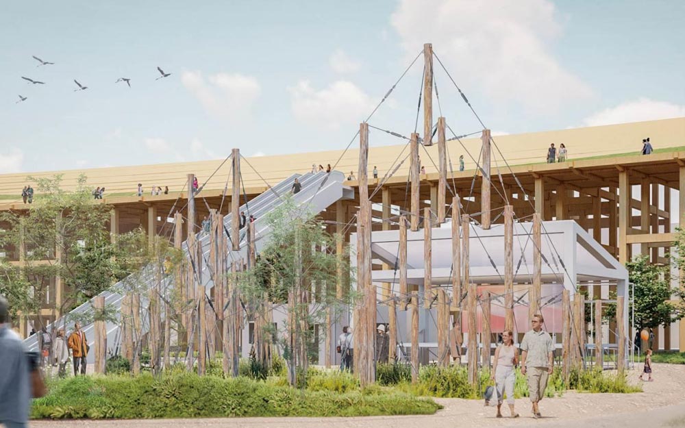 森の中のような、木々に囲まれたイベント広場です。森から切り出した未加工の丸太材を利用して大きな空間をつくることで、新しいかたちの森をつくろうと考えました。