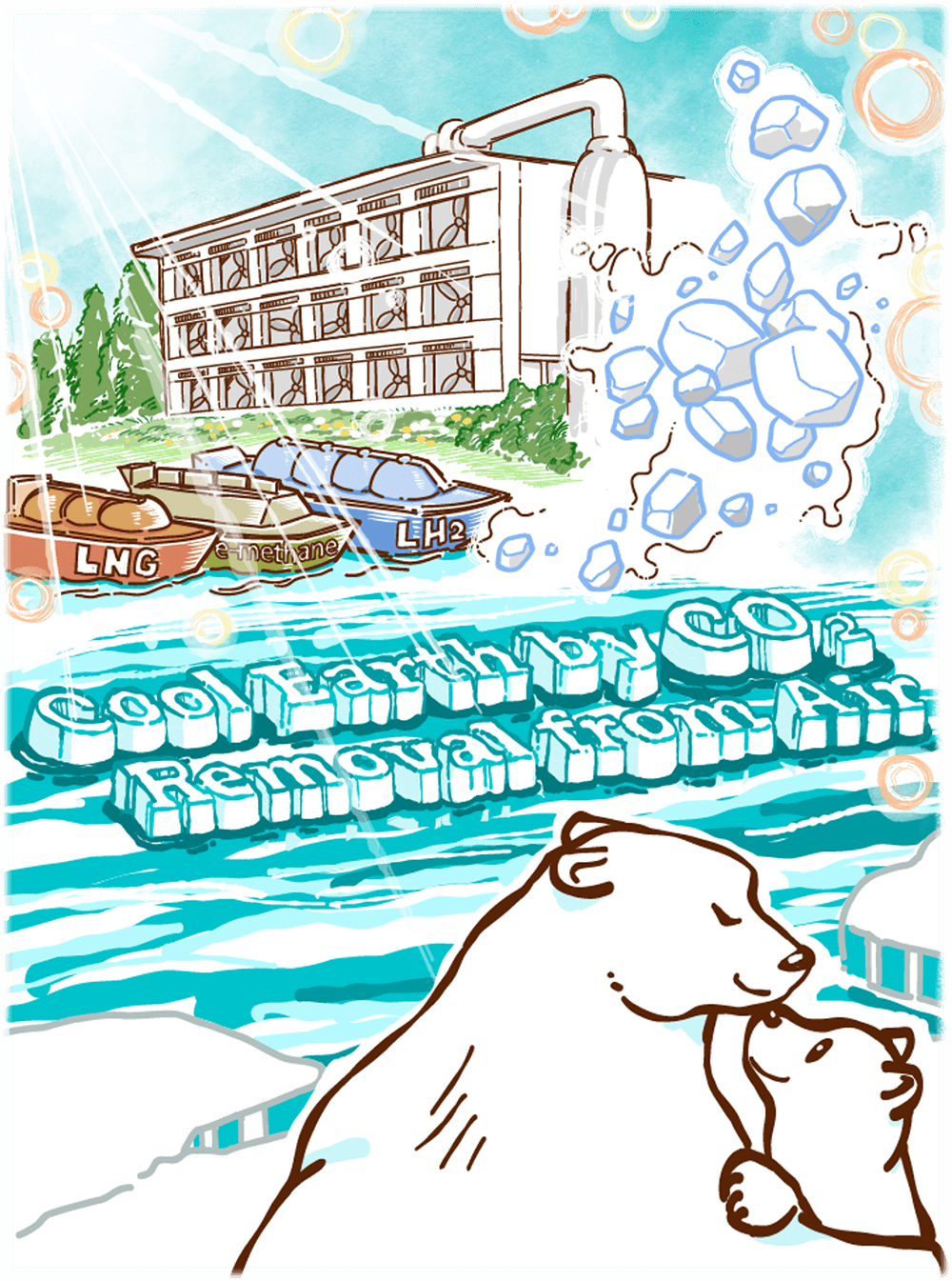 CO2を効率よく吸収する液体と、マイナス160℃以下の極低温を活用する新方式のCO2回収装置(DAC)をご覧いただきます。