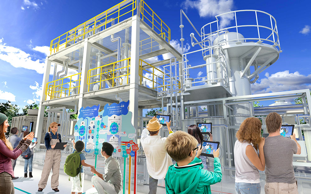 会場のカーボンリサイクルファクトリー 大阪ガスメタネーション実証*1設備では、会場内から回収した生ごみを発酵させてできる 「バイオガス」 中のCO2と再生可能エネルギー由来の水素から、都市ガスの主成分であるメタンを合成する 「メタネーション」をご覧いただけます。
