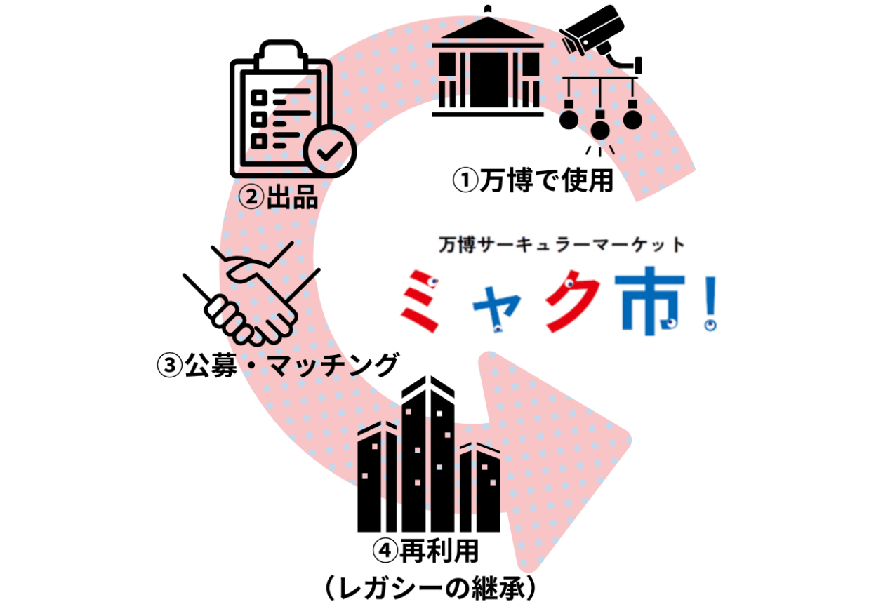 リユースマッチング事業は、万博閉会後に発生する建築物やアート、建材・設備、什器・備品等の資源の有効利用を図り、サステナブルな万博運営を実現するための取り組みです。